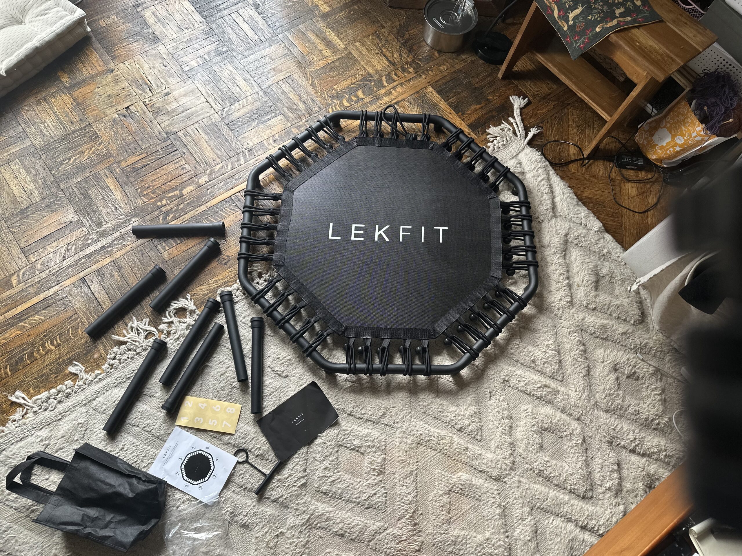 The assembly took about 10–15 minutes and required only screwing on the eight metal legs. LEKFIT does not offer assembly services because none are necessary, given the straightforward design. I love that LEKFIT’s rebounder supports up to 300 lbs., significantly more than my previous model, which supported only 130 lbs.